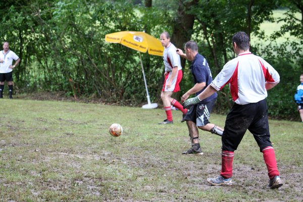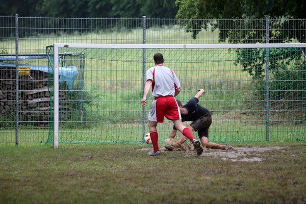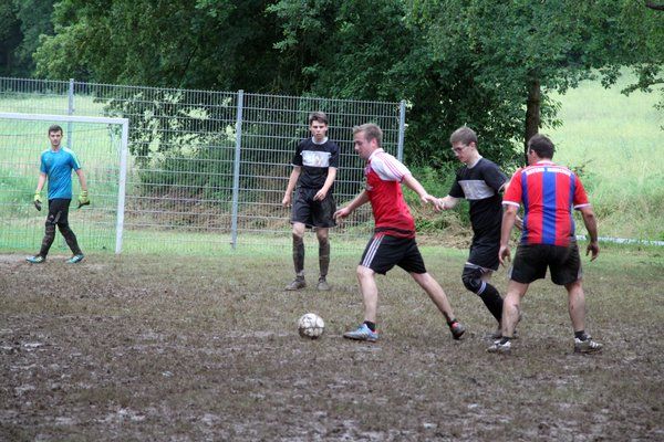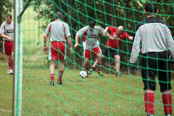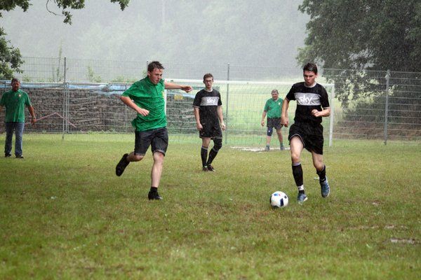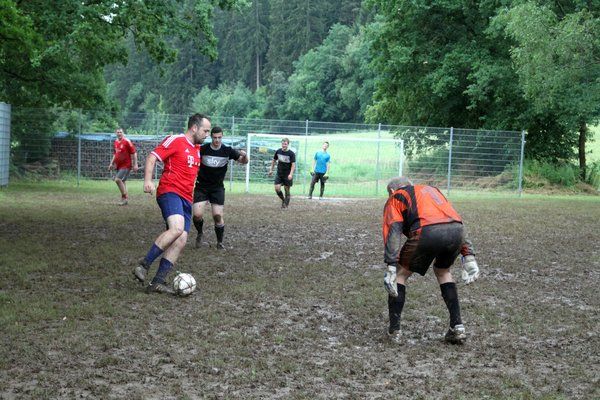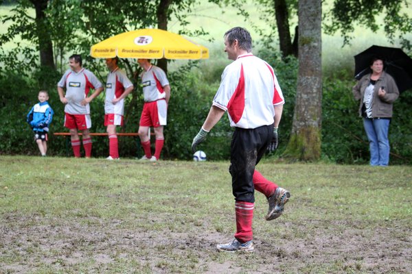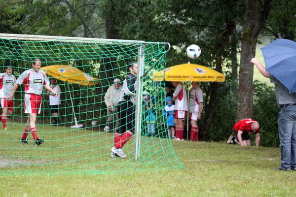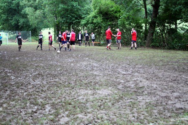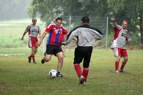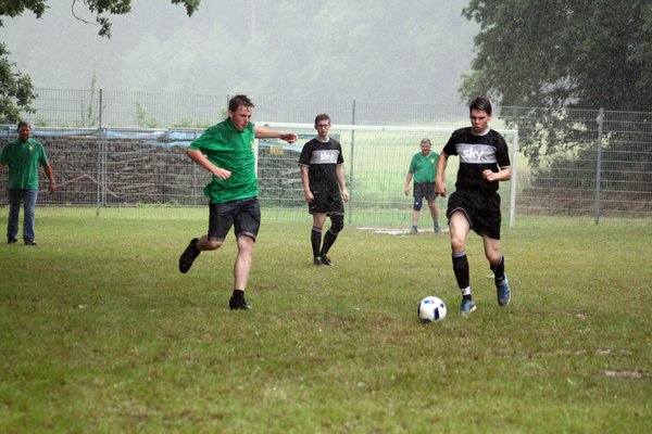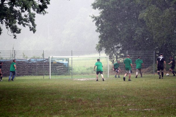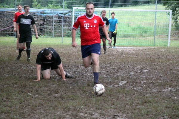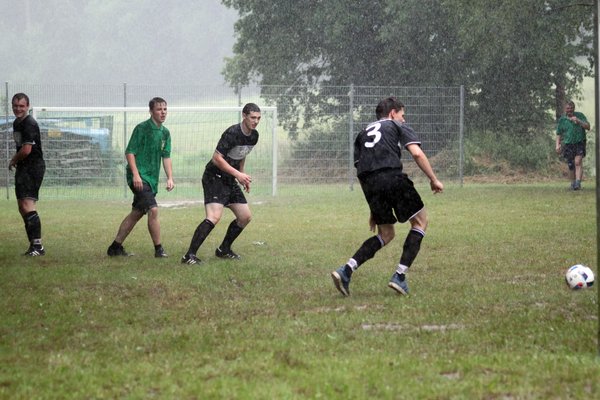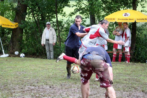 Nachdem es tagelang immer wieder Starkregen gegeben hatte, war der Rasenplatz schon zu Beginn ziemlich aufgeweicht. Als die Spiele ausgelost waren - neben den Vereinen waren auch die „Schwanzlstirzer“ angetreten - und das erste Spiel begann, setzte „programmgemäß“ erneut der Regen ein. Es goss zeitweise wie aus Kübeln als unter Leitung von Oberschiedsrichter Johann Eichenseer jede Mannschaft gegen jede spielte. Schon bald war der Platz tiefläufig, das Wasser spritzte nur so und die Spieler rutschten teilweise mehr und lagen im Dreck als dass sie ordentlich spielen konnten. Das Ganze gestaltete sich denn auch als Schlammschlacht auf matschigem Untergrund und die Fußballer waren völlig durchnässt. Trikots und Spieler von Schlamm bedeckt.