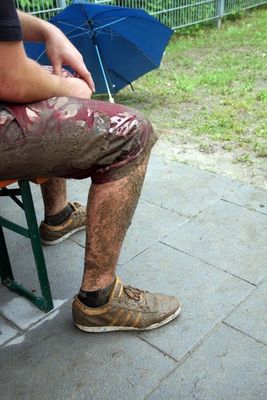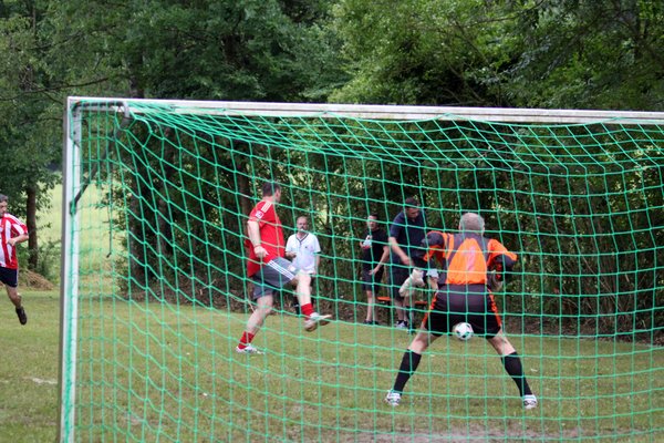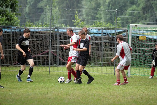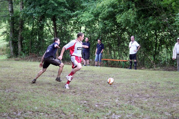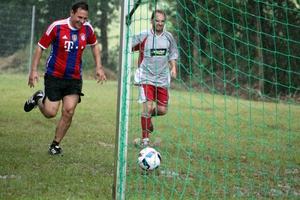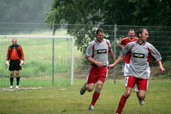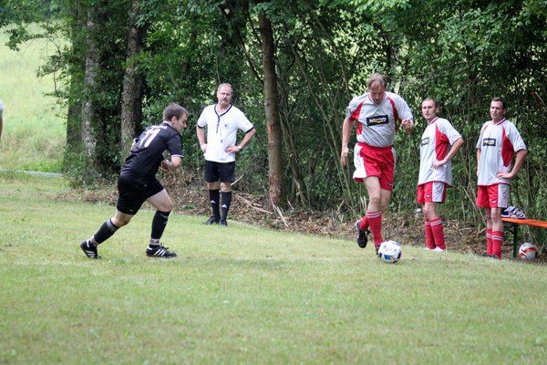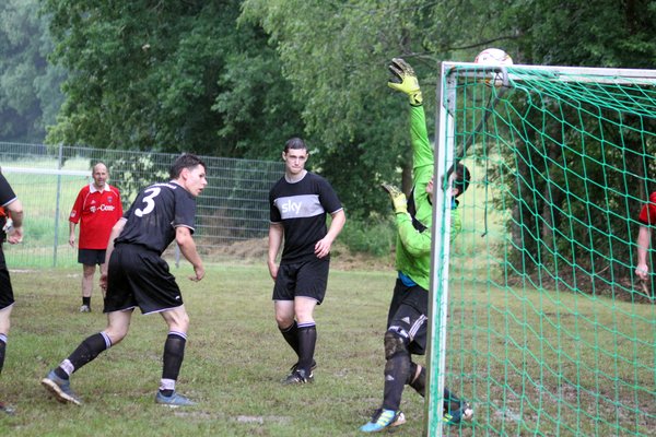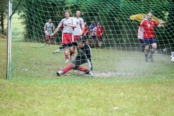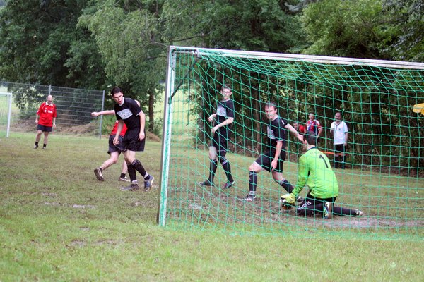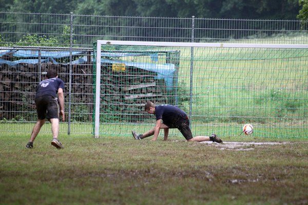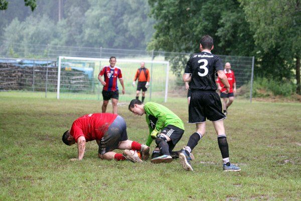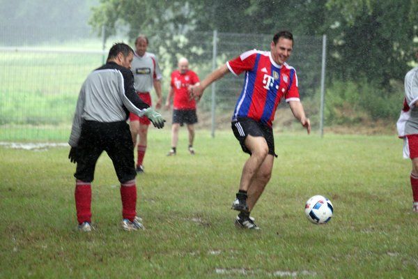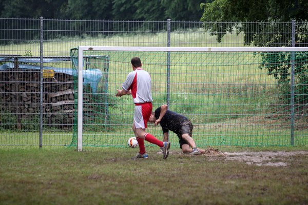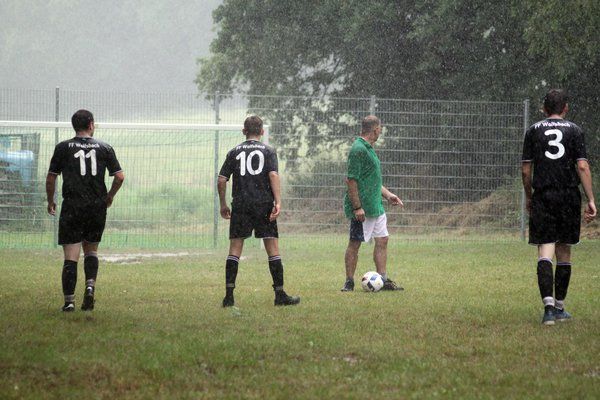 Nachdem es tagelang immer wieder Starkregen gegeben hatte, war der Rasenplatz schon zu Beginn ziemlich aufgeweicht. Als die Spiele ausgelost waren - neben den Vereinen waren auch die „Schwanzlstirzer“ angetreten - und das erste Spiel begann, setzte „programmgemäß“ erneut der Regen ein. Es goss zeitweise wie aus Kübeln als unter Leitung von Oberschiedsrichter Johann Eichenseer jede Mannschaft gegen jede spielte. Schon bald war der Platz tiefläufig, das Wasser spritzte nur so und die Spieler rutschten teilweise mehr und lagen im Dreck als dass sie ordentlich spielen konnten. Das Ganze gestaltete sich denn auch als Schlammschlacht auf matschigem Untergrund und die Fußballer waren völlig durchnässt. Trikots und Spieler von Schlamm bedeckt.