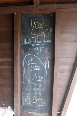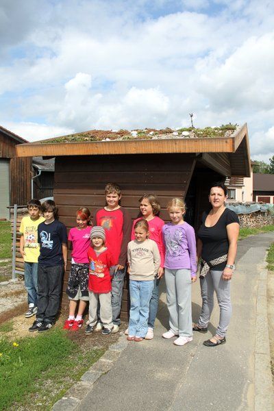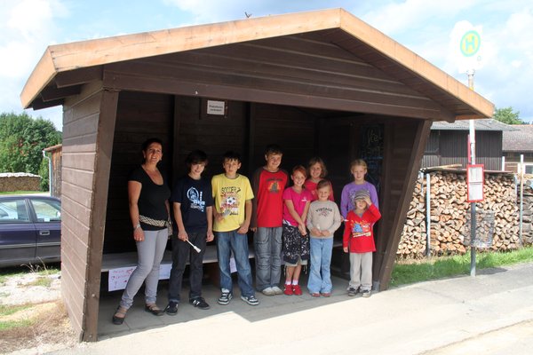 Gestern waren neun Kinder unter Anleitung von Alexandra Graf fleißig bei der Ferienaktion „Unser Bushäusl soll schöner werden“. Sie sorgen für Ordnung im Unterstellplatz, strichen die neue Bank und beschrifteten mit Farbkreiden die beiden Tafeln an der Seite mit lustigen Sprüchen. „Heute ist ein schöner Tag!“, „Ich liebe Züge“, „Die Ferien sind schön!“ „Viel Spaß!“, „Viel Glück!“ „Gute Fahrt!“ oder „Schule ist schön!“ ist nun u. a. zu lesen. Die Schriften können wieder gelöscht und neue angebracht werden. Damit hofft man zu verhindern, dass das Bushäusl durch Schmierereien oder Graffittis verunziert wird.