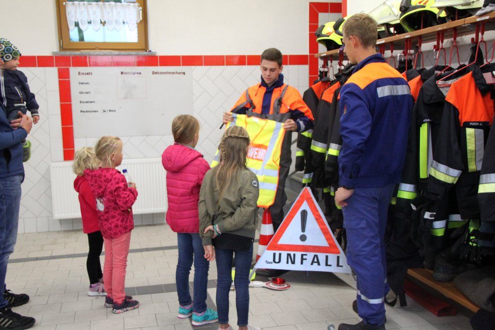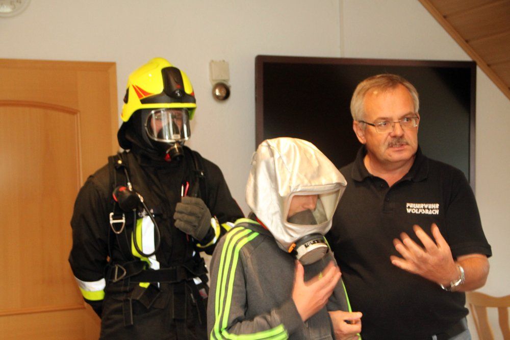 Sie erfuhren vom Kommandanten die Notwendigkeit von Feuer- und Rauchwarnmeldern, wie man einen Notruf an die Notrufnummer 112 richtig absetzt. Jugendwart Julian Pusch zeigte ihnen die Schutzausrüstung der Feuerwehrleute und die Atemschutzausrüstung, betonte, dass sie vor diesen „Marsmenschen“ im Ernstfall keine Angst haben müssen und sich nicht verstecken dürfen, sich vielmehr melden müssen. Die Kinder durften auch Fluchthauben aufsetzen. „Die können euer Leben retten!“ erklärte er. Außerdem wurde den Kindern ein Videofilm über Brandbekämpfung gezeigt.