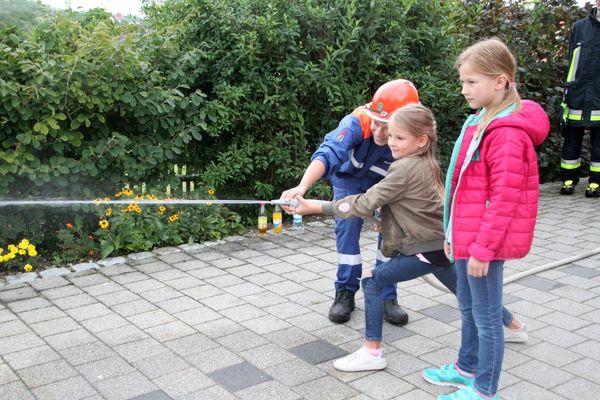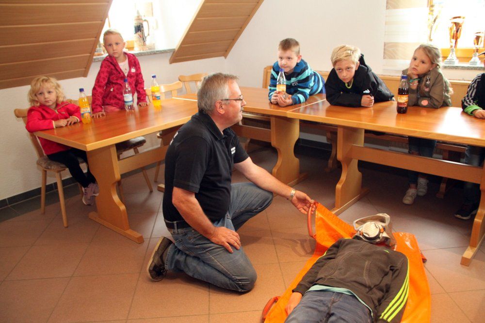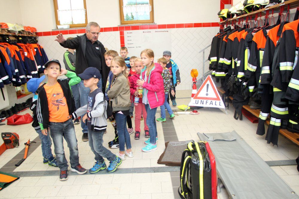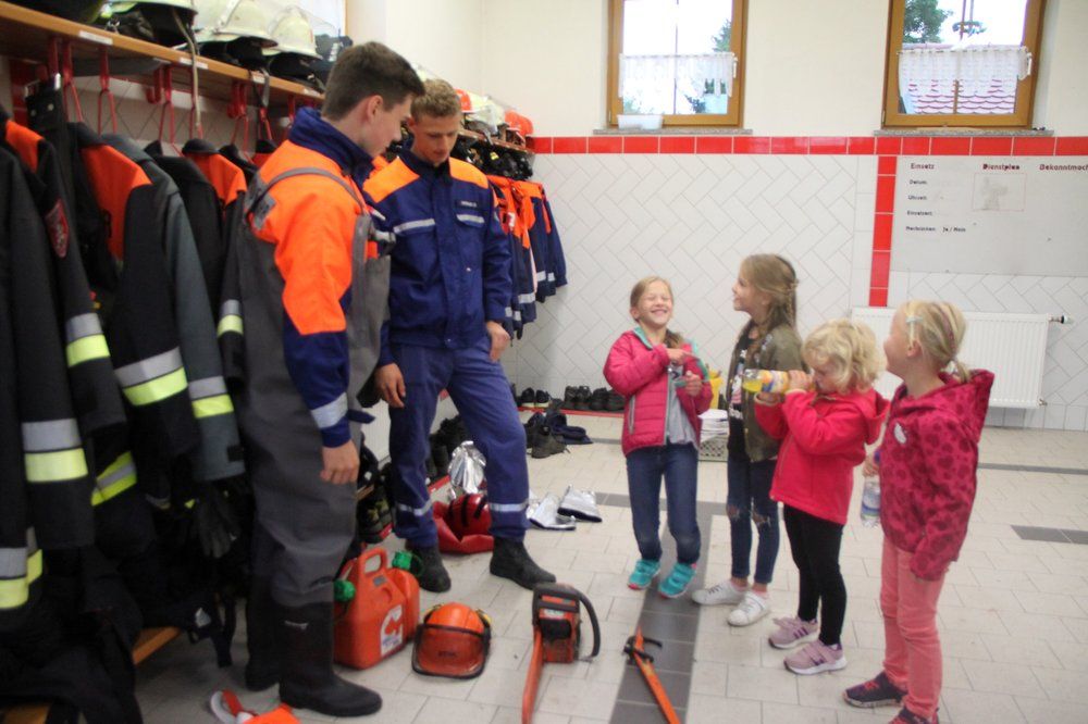 Im Feuerwehrgerätehaus waren Geräte aufgebaut. Auf der Krankentrage durfte sie „Platz nehmen“ und wurden „gerettet“, mit Hilfe des Rettungsrucksacks „verarztet“. Erläutert wurde ihnen die Verkehrswarneinrichtungen der Feuerwehr, Spezialschutzausrüstungen der Feuerwehr wie Imkeranzug, Wathose, Hitzeschutzanzug, des weiteren  Motorsägen und Schnittschutzhosen gezeigt, sie über Löschaufbau mit Verteiler und Strahlrohr aufgeklärt.