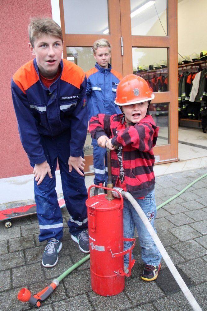 Dann aber ging es ins Freie, und sogleich enterten die Kids das Feuerwehrauto TSF (Tragkraftspritzenfahrzeug). Sie wurden durch stellvertretenden Kommandanten Dominik Ernst und Jugendwart Julian Pusch den Jungfeuerwehrlern David Ernst, Jugendsprecher Daniel Fröhlich, Sophie Graf, Benedikt Pusch, Alexandra Schindler, Elias Schönfelder und Louis Übeler als Helfer zugeteilt. Gleich ging es für die Kinder auf dem Festplatz ans Eingemachte: Stellvertretender Dominik Ernst und stellvertretender Jugendwart Philipp Wiesner demonstrierten realistisch in einer Fettbrandsimulation in einem Topf, „dass ein Fettbrand auf keinen Fall mit Wasser gelöscht werden darf“. Eine Decke oder Sand sind dagegen sinnvoll. Eine riesige Stichflamme überzeugte die Kids.