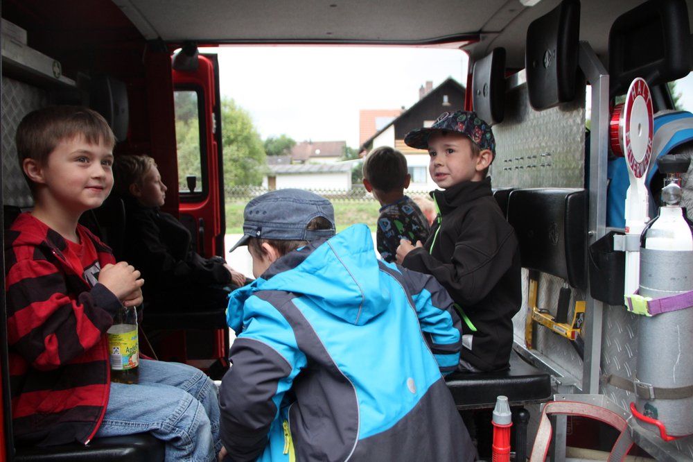 Am Tragkraftspritzenfahrzeug (TSF) der Wolfsbacher Wehr sahen die Buben und Mädchen die weiteren zur Brandbekämpfung aber auch Lebensrettung notwendigen Geräte. „Ganz cool“ fanden sie, dass sie sich auch in das Feuerwehrzeug setzen durften und „Tatü-Tata“ Blaulicht und Martinshorn einschalten durften.