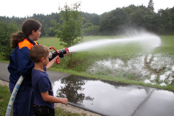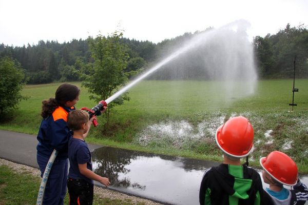 Groß war der Spaß beim Zielspritzen auf Flaschen mit der Kübelspritze, wobei Louis Übler und Elias Schönfelder assistierten. Beim Zielwerfen mit Rettungsleinen. Viel Spaß hatten die Kids auch beim Spritzen – unter Aufsicht der Jugendfeuerwehrler Sophie Graf und Alexandra Schindler natürlich – mit dem C-Strahlrohr.
