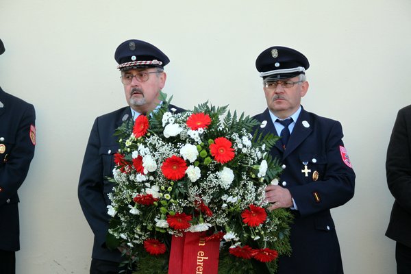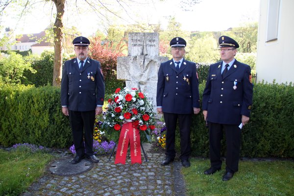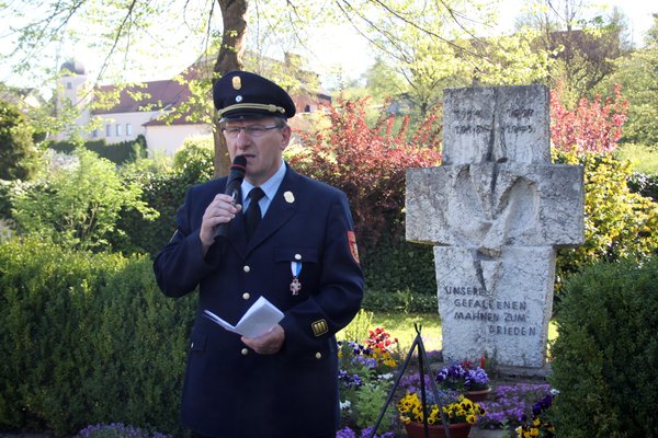Am Kriegerdenkmal wurde der verstorbenen Kameraden, die sich eingesetzt hatten, um Hab, Gut und Leben anderer zu retten. Die Hymne der bayerischen Feuerwehren erklang. „Lass sie alle bei dir o Herr für das ewige Leben geborgen sein“, betete Pfarrer Sturm. KBI Hubert Blödt erinnerte an die Gefahren, welchen die Feuerwehrleute bei ihren Einsätzen begegnen. „Sie stehen mit Idealismus und Bereitschaft dem Nächsten in seiner Not bei“, betonte er. „Schon seit fast 150 Jahren gibt es hier Frauen und Männer, die sich dem Leitsatz ‚Gott zur Ehr’. Dem Nächsten zur Wehr’ verschrieben haben. Kommandant Günter Schindler und Feuerwehrvorsitzender Heinrich Eichenseer legten im Gedenken der verstorbenen Kameraden einen Kranz nieder, wahrend die Kapelle „Ich hatt’ einen Kameraden“ spielte.