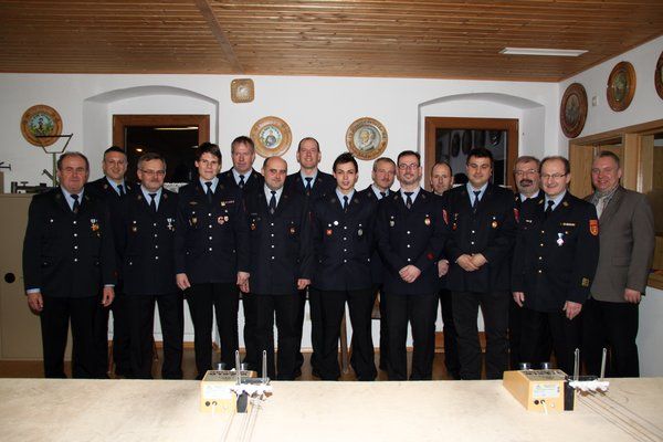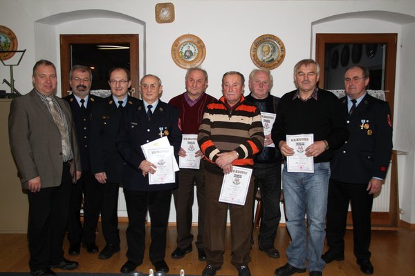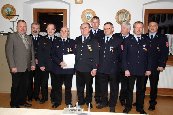 Mit Urkunden und dem Ehrenkreuz in Silber für 25 Jahren aktiven Feuerwehrdienst zeichneten KBR Fredi Weiß und KBI Hubert Blödt Lothar Donhauser, Hans Eichenseer, Edwin Marschall, Mathias Reinhardt, Günter Schindler und Josef Singer aus, für 40 Jahre Hans Blank, Heinrich Eichenseer und Herman Senft.
