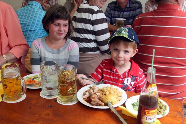 „Mir g’hörn zam! Hofstetten“ war auf den T-Shirts der Bewohner zu lesen. Und dies bewies wieder einmal mehr die Dorfgemeinschaft Hofstetten. Sie hatte alles unter der Dorflinde bestens vorbereitet, für ein geräumiges Zelt gesorgt, so dass bei eventuell drohendem Regen die treuen Gäste bei Frühschoppen und Mittagessen dicht gedrängt im Trockenen sitzen konnten. Dazu gab es saftigen Spanferkelbraten mit „echten Reiberknödeln“, leckere Salate, Steaks oder Rostbratwürsteln vom Grill, später zum Kaffe selbstgebackene Kuchen, Torten und Küchln. Natürlich auch kühle Getränke. Nachmittags und abends sorgte das „Duo-Zapf“ mit Musik und Gesang für Stimmung.