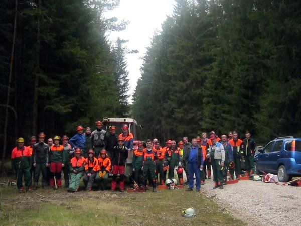 Nach einer von der Freiwilligen Feuerwehr Wolfsbach organisierten Mittagspause mit Schnitzel und Kartoffelsalat fuhren die Teilnehmer in ein nahe Wolfsbach gelegenes Waldstück. Dort wurde unter Anleitung von Thilo v. Hanstein sowie der beiden extra zu dieser Ausbildung angereisten Forstwirte Roland Pfindel aus Mühlhausen bei Neumarkt und Robert Piehler aus Freudenberg (Mitglied der FFW Freudenberg/Wutschdorf) das am Vormittag gelernte in der Praxis geübt. Jeder musste mindestens einen stehenden Baum unter Berücksichtigung: von Baumbeurteilung, Fallkerb, Bruchleiste, Bruchstufe, Fallbereich (Absperrung), Fällrichtung, Rückweiche, Warnruf, Entastungstechniken, vorgehen bei Hängern sowie Arbeiten am Wurzelteller selbstständig fällen.