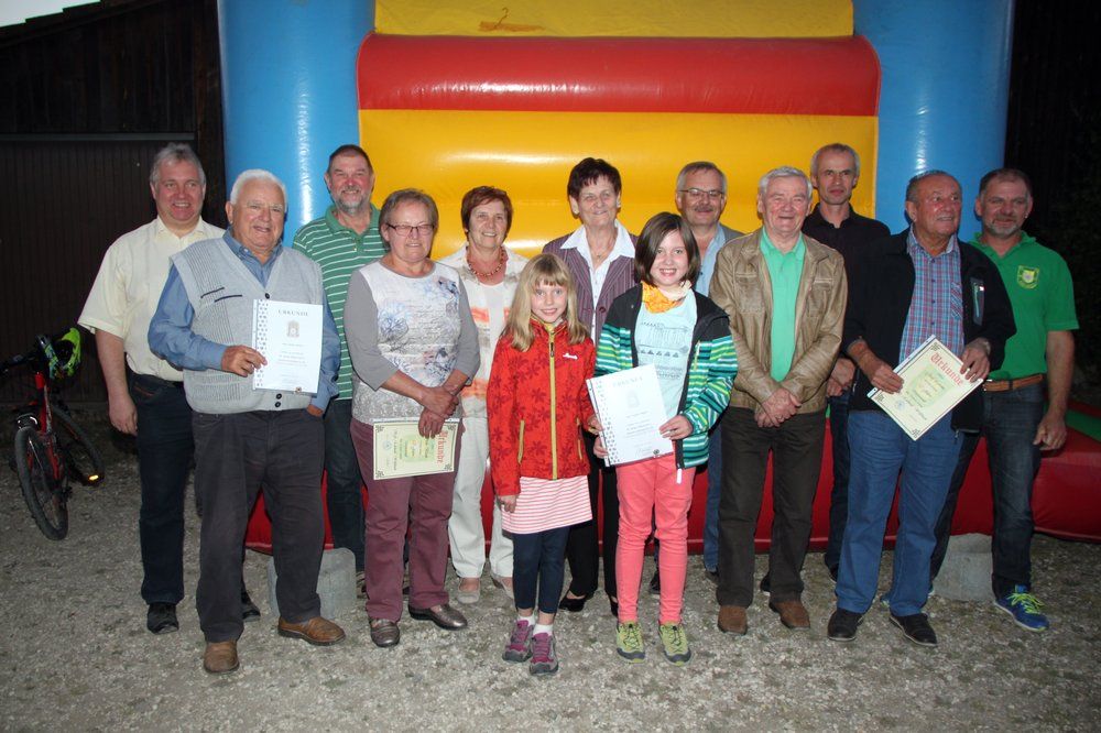 Gemeinsam von Bürgermeister Markus Dollacker und Schützenmeister Heiner Graf erhielten die silberne Ehrennadel des Deutschen Schützenbundes für 25 Jahre aktive Mitgliedschaft Josef Singer, Gerhard Gietl, Esther Bieber, Joachim Baldauf und  Doris Fischer Urkunde und DSB-Ehrennadel in Silber. Für 40 Jahre Anton Reindl und Anni Fleischmann, Bernhard Senft für 50 Jahre und Georg Lehmeier sogar für 60 Jahre für verdiente und langjährige aktive Mitgliedschaft.