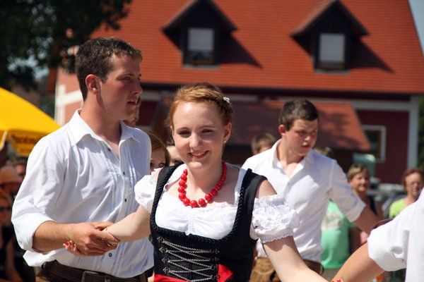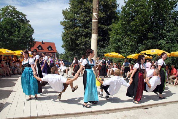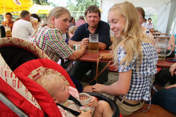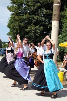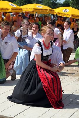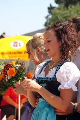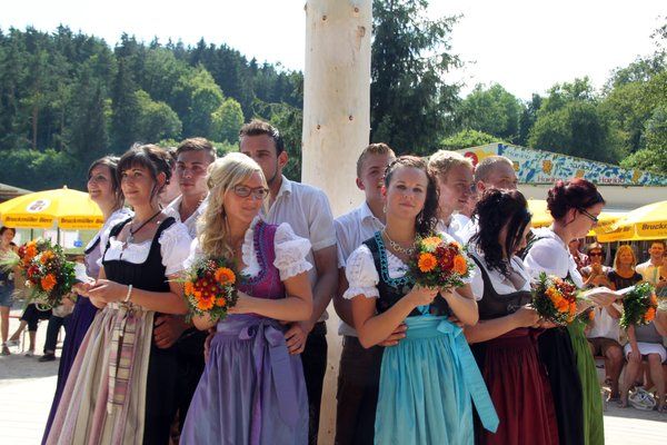 „Die Woischbecka Kirwa, des is die beste, mei liaba“! sangen die feschen Kirwapaare. „D’ Woischbecka Kirwa is da Hit!“ Viele Zuschauer verfolgten trotz fast unerträglicher Hitze das Spektakel, applaudierten fleißig bei den kräftigen Juchzern und Rufen „Wer hot Kirwa? Die feschesten Kirwamoidln, die strammsten Kirwaboum, die beste Kirwamusi? Mir natürli’!“ „Woischba, deine Berch und deine Leit. Woischba, du bist mei größte Freid!“ wurde intonuert und das neue „Oberkirwapaar“ ausgetanzt: Sabrina Honig und Andreas Graf. Ganz bestimmt nicht ohne Grund sangen schließlich alle anderen: „Mir ham des schönste Oberkirwamoidl!“ Für die Kirwapaare gab es hinter der Bar eine ganz „exklusive und für Bevölkerung und Gäste nicht zugängliche Erfrischung: einen Abkühlpool mit drei Metern Durchmesser.