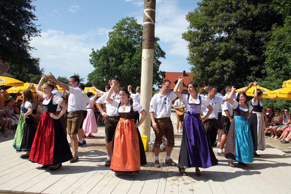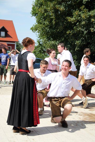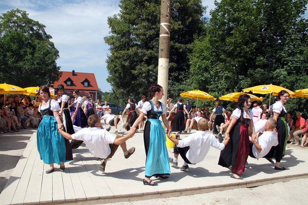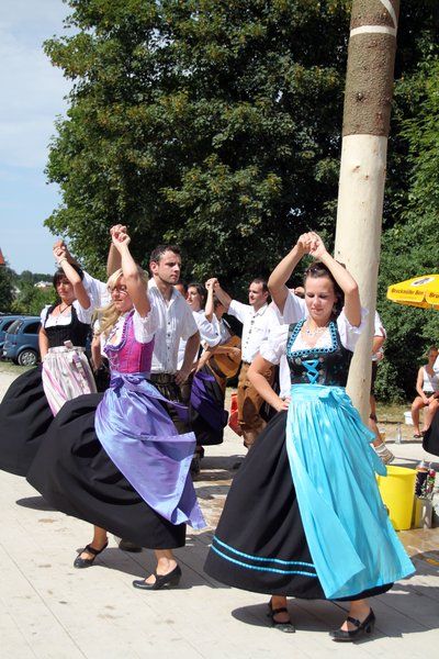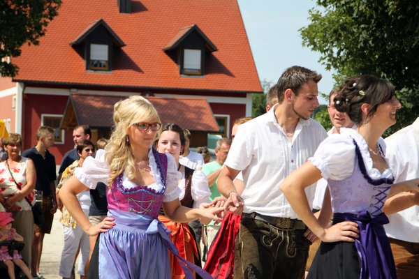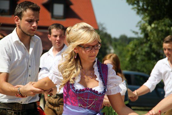 Bei tropischen Temperaturen (38 Grad Celsius waren im Schatten gemessen worden, doch es gab keinen) wurden nachmittags die zwölf feschen Kirwapaare mit dem „Kirwa-Shuttle-Traktor“ zum Festplatz kutschiert. Die strammen Kirwaburschen hoben ihre hübschen Kirwamoidln herunter und tanzten in langen Dirndln und langen Lederhosen selbst einstudiert „Schuhplattler“, „’S Mühlradl“, „’s Dirndl mit ’m roudn Mieda“, den „Sechser-Schloch“, einen „Boarischen“ und „’s Louder“ zur Musik der „Hoglbouchan“ traditionsgemäß den Kirwabaum aus. Die Freiwillige Feuerwehr sorgte - Gott sei Dank – für feuchte Abkühlung. Mit einer Kübelspritze besprühte sie Kirwapaare, um sie vor einem Hitzschlag zu bewahren. Mit deftigen G’stanzln berichteten sie über Geschehnisse des Dorfes und der Gemeinde Ensdorf.