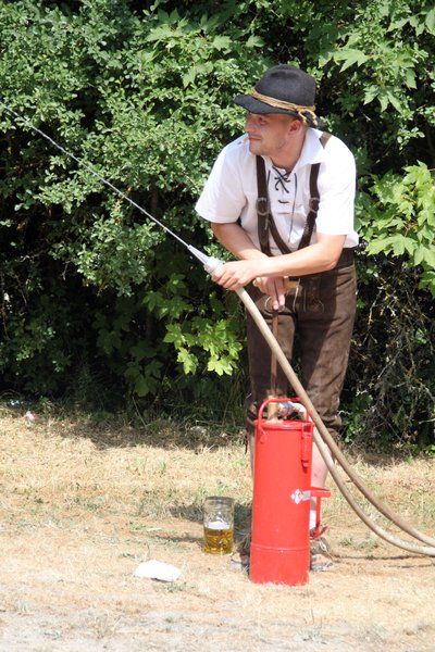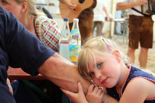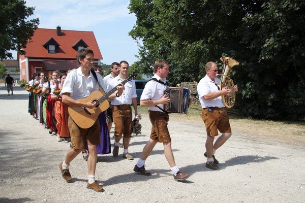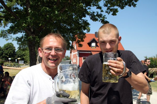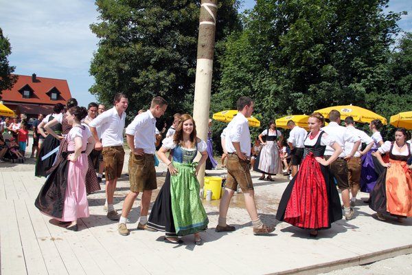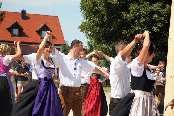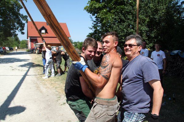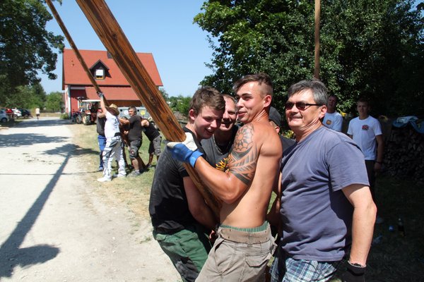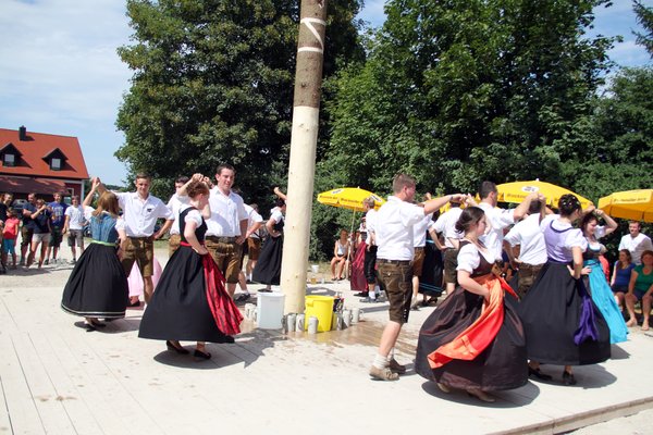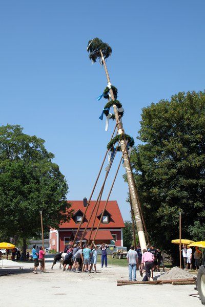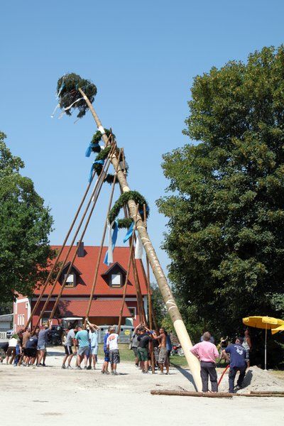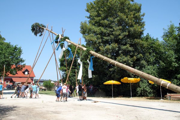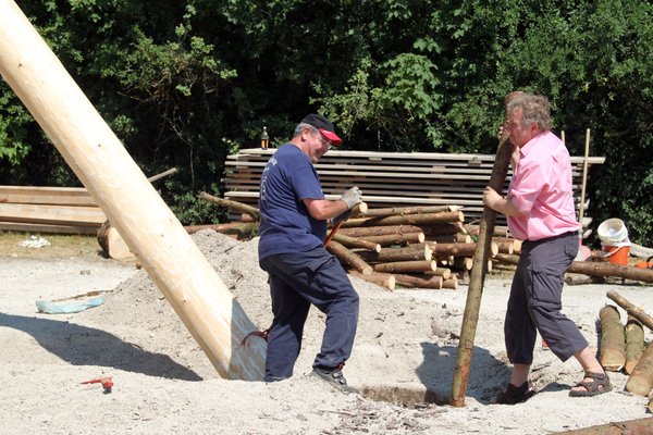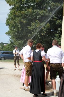 Am Nachmittag dann hievten 36 starke Burschen und Männer bei sengender Hitze von gemessenen 34,5 Grad Celsius und wolkenlos blauem Himmel den mächtigen Kirwabaum mit Muskelkraft und sechs „Goaßn“ in harter und äußerst schweißtreibender Arbeit in gut einer Stunde in die Senkrechte. Dabei hörten die Mannsbilder nicht auf das Kommando von Feuerwehrkommandant Christian Holler, sondern auf die Rufe des bewährten „Baummeisters“ Matthias Reinhardt: „Manna, san mas? Pack’ mas! Mach ma wieder an kloana Schub: Hau-Ruck!“ Die Kirwamoidl eilten eifrig hin und her und sorgten dafür, dass die Männer nicht verdurschten und Kraft wegen Flüssigkeitsverlust erleiden. „Lochmeister“ war wie seit Jahren schon Feuerwehrvorsitzender Heinrich Eichenseer, zum Schluss assistiert von Bürgermeister Markus Dollacker. Vor allem nach der harten Arbeit in der „Bullenhitze“ schmeckte die erste Maß frisches Kirwabier besonders gut! – „Zisch“- und weg war sie.