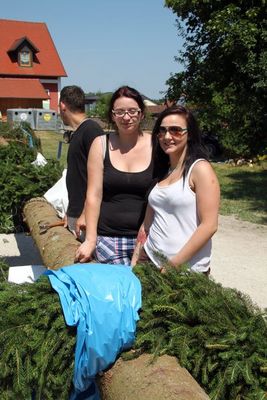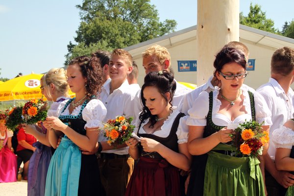 Dort beim Vilstal-Rad-Wanderweg wurde nicht lange gefackelt, der Baum teils geschält, „geringelt“ und „Wolfsbach 2013“ eingeschnitzt. Schnitzer und Ringler waren Andreas Donhauser, Martin Eck, Johannes Feigl, Stefan Götz, Andreas Graf und Michael Reinhardt. Die zwölf hübschen Kirwamoidln hatten schon tags zuvor drei große Kränze ausFichtenreiser gebunden und mit weiß-blauen Schleifen versehen. Auch den Wipfel des Kirwabaumes verzierten sie mit bunten Bändern.