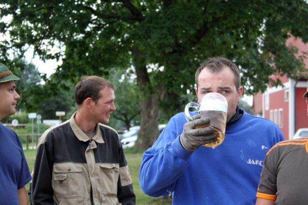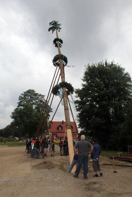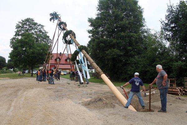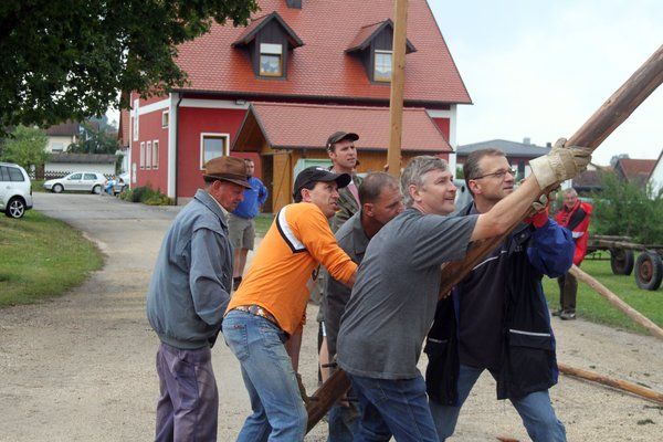 Nach zweitägigem Starkregen wurde schnell noch der Festplatz frisch aufgeschottert. Am Nachmittag hievten dann 36 starke Burschen und Männer ohne Regen den mächtigen Kirwabaum mit Muskelkraft und vier „Goaßn“ in harter Arbeit in der Rekordzeit von einer guten Stunde in die Senkrechte. Dabei hörten die Mannsbilder nicht auf das Kommando von Feuerwehrkommandant Christian Holler, sondern auf die Rufe des „Baummeisters“ Matthias Reinhardt: „Manna, san mas? Pack mas! Mach ma wieder an kloana Schub: Hau-Ruck!“ Da schmeckte nach getaner Arbeit die erste Maß frisches Kirwabier besonders! – „Zisch“- und weg war sie.
