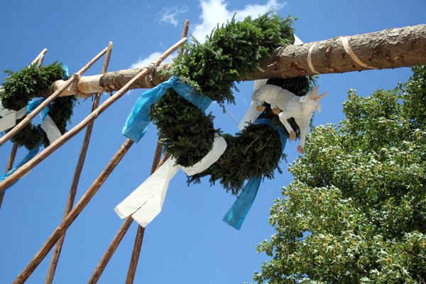Am Nachmittag dann hievten 30 starke Burschen und Männer bei angenehmen Temperaturen aber gefährlich starkem Wind den mächtigen Kirwabaum mit Muskelkraft und fünf „Goaßn“ in harter und heuer ohne schweißtreibende Arbeit in die Senkrechte. Dabei hörten die Mannsbilder auf die die Rufe des bewährten „Kirwabaumoasters“ Matthias Reinhardt: „Mach’ma wieder an kloana Schub! Pack’ ma’s! Hou Ruck!“ forderte er immer wieder die 30 starken Männern an fünf „Goßn“ auf, den Baum in die Senkrechte zu bringen. Die Kirwamoidl eilten eifrig hin und her und sorgten dafür, dass die Männer nicht verdurschten und Kraft wegen Flüssigkeitsverlust erleiden. Auf dem Kirwabaum hängt unter dem zweiten Kranz eine Trophäe: Das von den Riedenern „geraubte“ Maskottchen, der „Riedener Goaßbock“. Der kann von diesen gegen entsprechendes „Entgelt“ wieder ausgelöst werden.