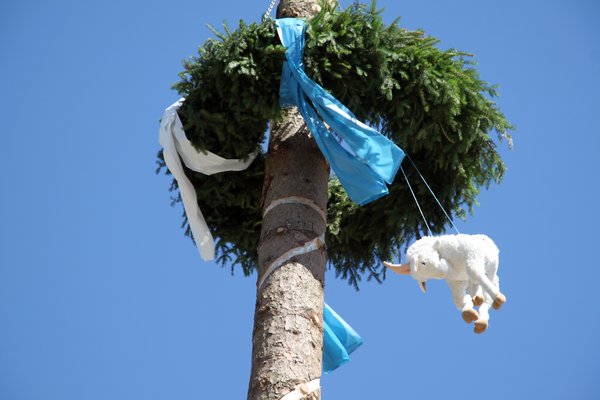 Dort beim Vilstal-Rad-Wanderweg wurde nicht lange gefackelt, der Baum teils geschält, „geringelt“ und „Wolfsbach 2015“ eingeschnitzt. Schnitzer und Ringler waren Andreas Donhauser, Johannes Feigl, Sebastian Götz und Josef Weigert. Die neun hübschen Kirwamoidln hatten schon zwei Tage zuvor drei große Kränze aus Fichtenreiser gebunden und mit weiß-blauen Schleifen versehen. Auch den Wipfel des Kirwabaumes verzierten sie mit bunten Bändern.