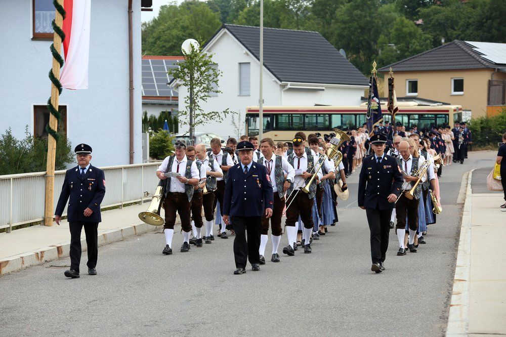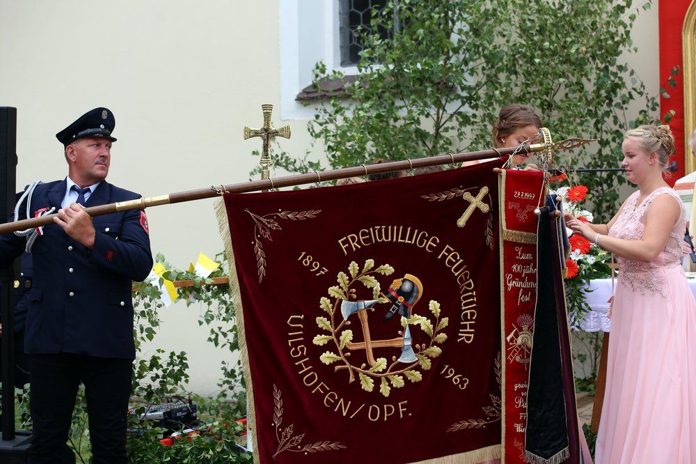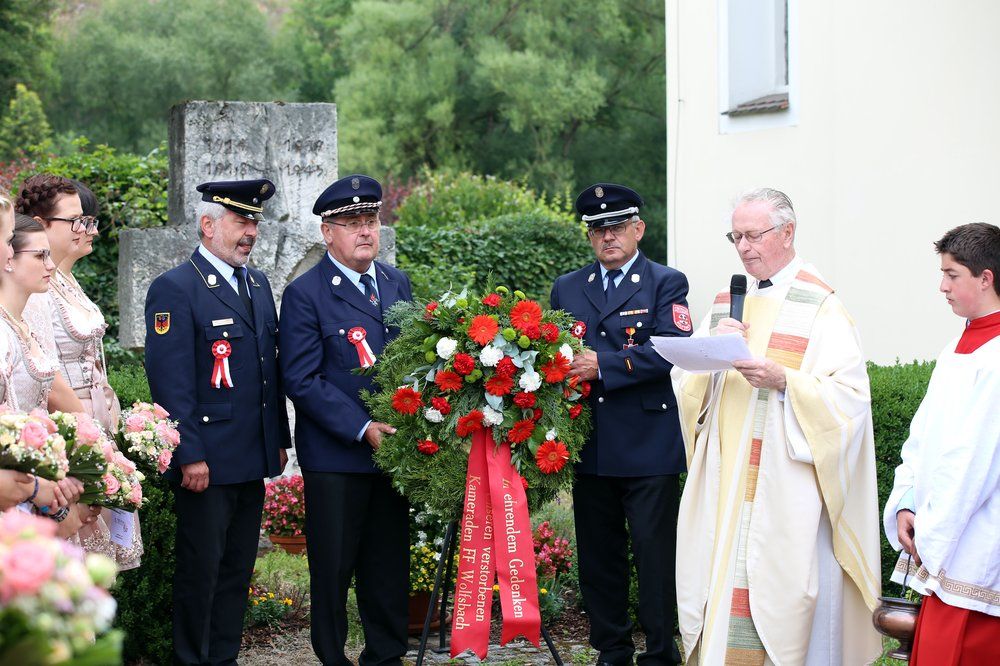 Den Gottesdienst zelebrierte Pfarrer Hermann Sturm. Am Ende des Gottesdienstes wurden die Fahnenbänder für die Fahnen der Feuerwehr Wolfsbach und Vilshofen gesegnet. Zahlreiche Feuerwehren aus dem Landkreis kamen schon zur Fahnenbandweihe mit anschließendem Totengedenken nach Wolfsbach. Bei angenehmen Temperaturen genossen alle ein Mittagessen im Zelt, bevor mit einem großen Festzug der nächste Höhepunkt folgte.