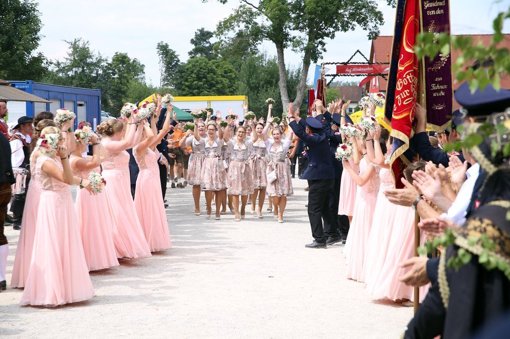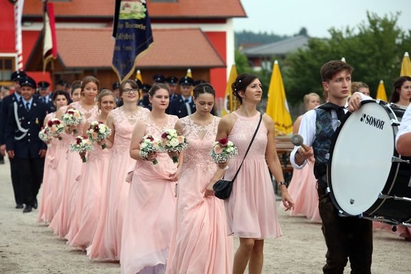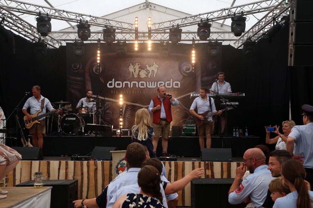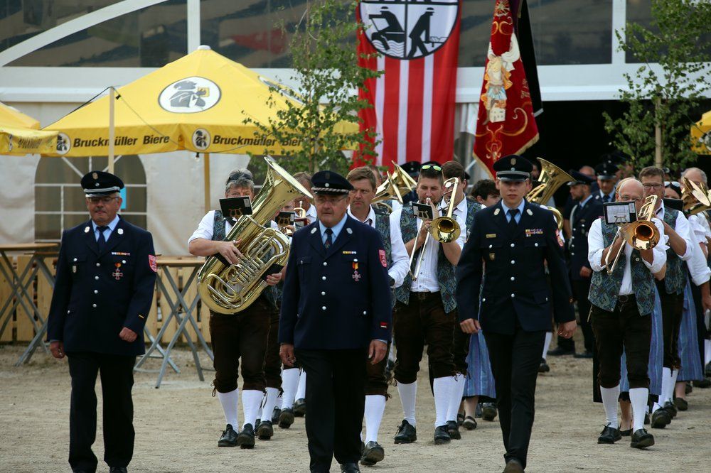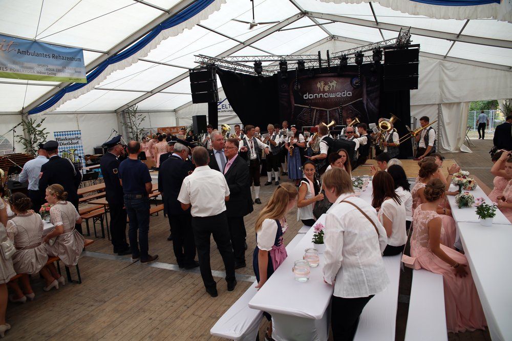 Zusammen mit dem Patenverein, der Feuerwehr Vilshofen, dem Schützenverein Wolfsbach, dem FC-Bayern-Fanclub Wolfsbach, der DJK Ensdorf sowie der Feuerwehr Wolfsbach aus Österreich, Ehrengästen und der Blaskapelle Dietldorf zog man ins gut gefüllte Festzelt ein. Nach einem perfekten Bieranstich spielte die Blaskapelle, bevor die Partyband "Volxxliga" die Stimmung anheizte.