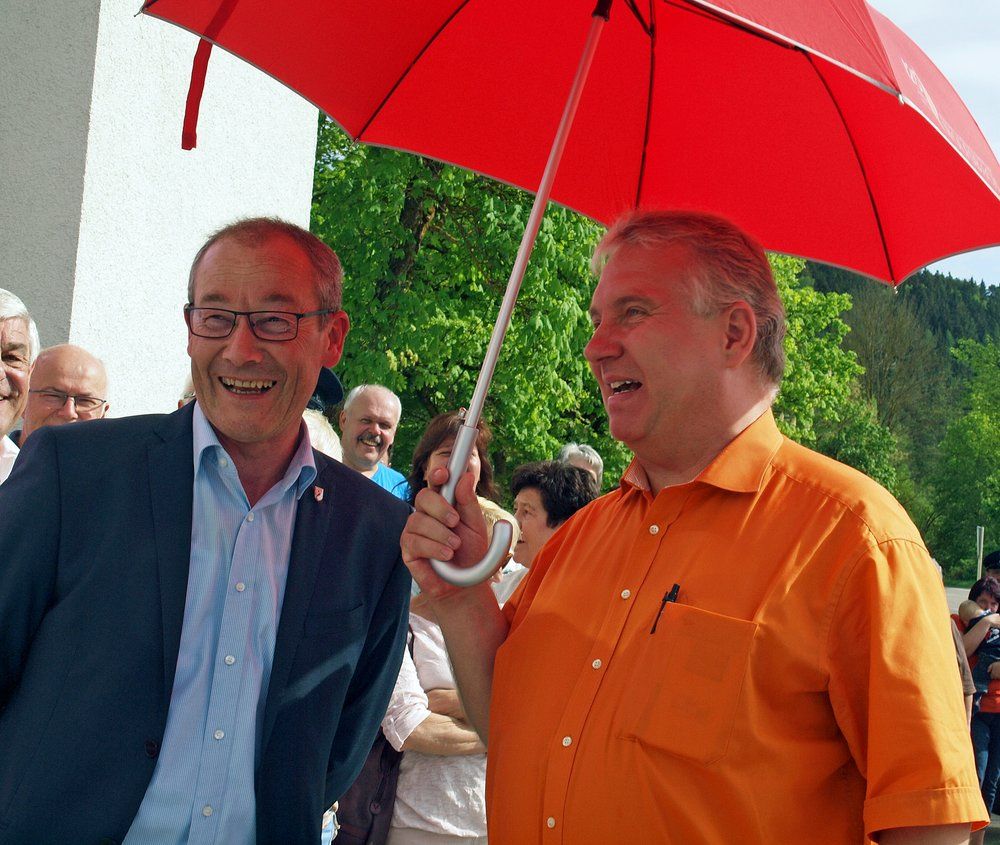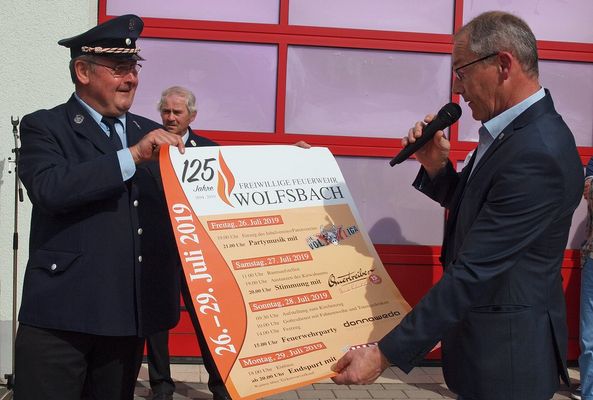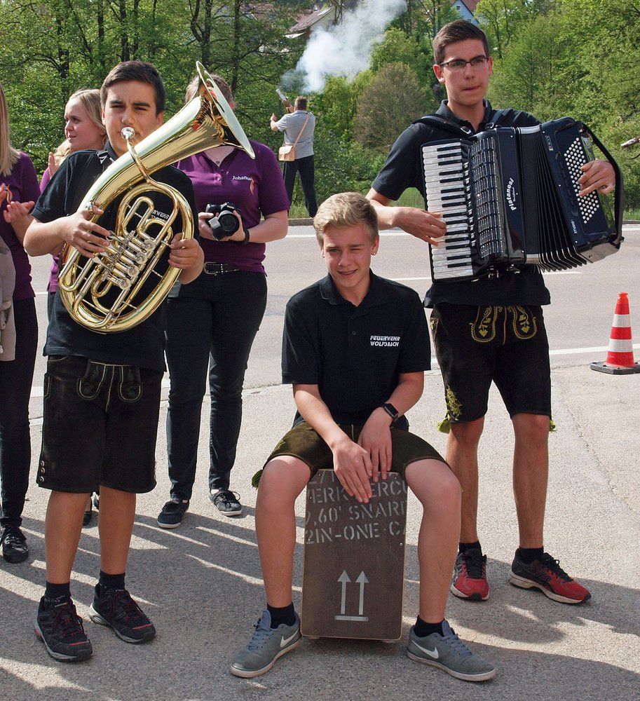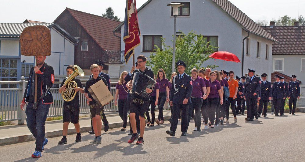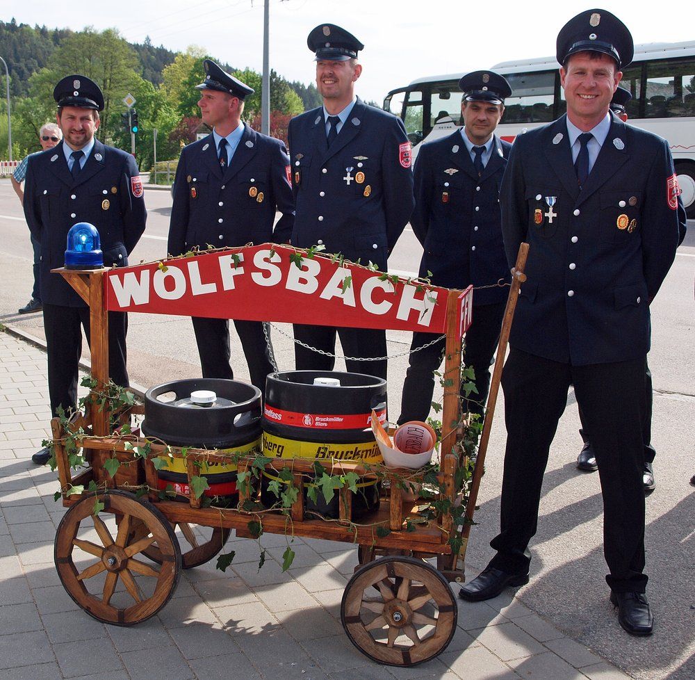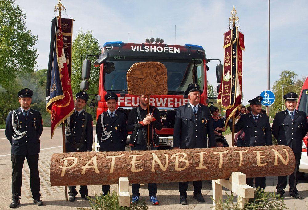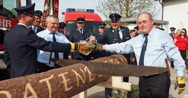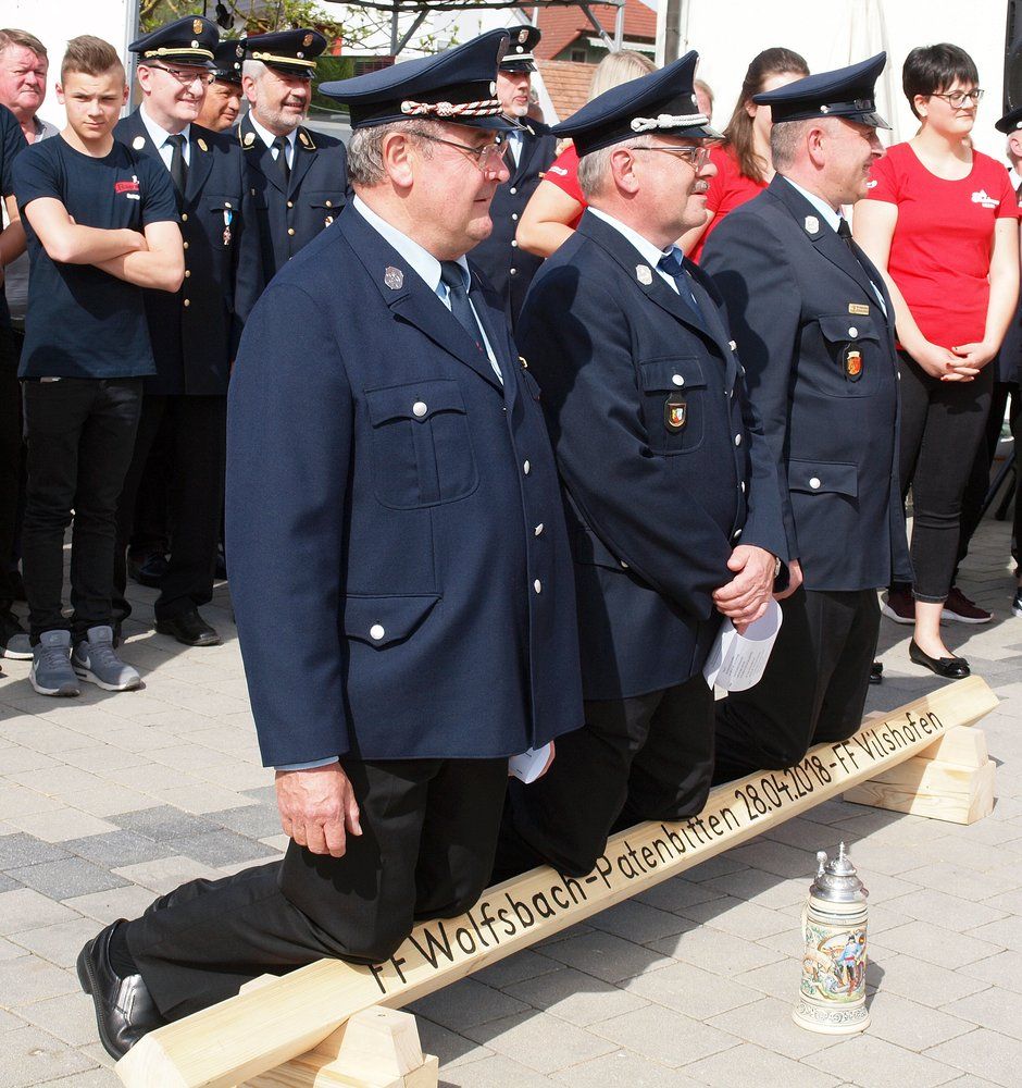 Zünftig spielten die Übler-Buam aus Wolfsbach auf, als die beiden Wehren mit ihren Fahnenabordnungen beim Feuerwehrhaus mit den Festdamen des Jubelvereins und, wie Vilshofens Feuerwehr-Vorsitzender Georg Edenharter betonte „unseren eigenen kurzfristig rekrutierten Festdamenanwärterinnen“ Aufstellung nahmen. Von der Landkreisführung der Feuerwehren war Kreisbrandrat Fredi Weiß, begleitet von Kreisbrandmeister Hubert Blödt und Kreisbrandmeier Jürgen Ehrnsberger, nach Vilshofen gekommen. Den Wolfsbachern half es jedoch nicht, dass sie ein geschmücktes Leiterwagerl mit zwei Faßln Bier mitgebracht hatten – Holzscheitlknien war für Vorsitzenden Heinrich Eichenseer, Kommandant Günter Schindler und Festleiter Christian Holler angesagt. Da half kein Jammern. „Liebe Kameraden der Wolfsbacher Wehr, euer Anliegen ehrt und sehr. Zum Patenbitten seid’s heid komma, wir hom eich scho von weit’n vernomma,“ verkündete Vilshofens Vorsitzender und ließ die drei auf dem Scheitl schwitzen. Da kam Wolfsbachs Feuerwehrvorsitzender Heinrich Eichenseer kaum dazu für den 26. bis 29. Juli im kommenden Jahr zum 125-jährigen Gründungsfest einzuladen mit der Bitte an die Feuerwehrnachbarschaft „für’s Fest san mir scho fast komplett, blos koan Paten ham mia net. Ihr daad’s uns die Rechten sein. Wenn’s es machts, dat uns des g’frein.“ Und kniend sagte Kommandant Günter Schindler „A Bier und a Musi hama mitbracht für des Fest, dass sich’s leichter Bitten lässt.“ Und er bat mit seinen Leidensgenossen – „… aber am besten lasst’s uns net lang leid’n, sunst dama uns nu d’ Knia aufreib’n.“ Da aber kam er bei Edenharter an den Falschen, der reimte „ihr habt’s scho dabei die Fassl Bier, des langt aber niad der Feierwehr und mir. Die Pflichtaufgabe, das was des Bier – etz kummt aber no die Kür.“ Da Wolfsbach direkt am Hirschwald gelegen sei, führte Edenharter aus, und auch eine lange Sägewerks-Tradition habe, sei es logisch, dass die Aufgabe mit einem Baum zu tun habe. Einen etwa zweieinhalb Meter langen Baumstamm mit einer Zweimann-Handsäge – „und zwar nach Augenmaß möglichst genau in der Mitte“ – ohne Meterstab oder andere Hilfsmittel durchzusägen sei die Aufgabe. Bravurös lösten Wolfsbachs Vorsitzender und Kommandant zentimetergenau die Aufgabe und Edenharter gab bekannt „Wir san bereit für euer Fest und wünschen euch das Allerbest. Dass wir Patenverein wern, g’freit uns sehr, des is a für uns große Ehr.“ Mit dem Ehrenkrug der Wolfsbacher Wehr dankte Vorsitzender Eichenseer seinem Amtskollegen Edenharter für die Übernahme der Patenschaft. Bürgermeister Erwin Geitner betonte, „dass es unseren Feuerwehrkameraden, welche das ganze Jahr über sich ehrenamtlichen in ihrer Freizeit für ihre Mitbürger einsetzen, zusteht, heute beim Patenbitten kräftig zu feiern.“ Ensdorf Bürgermeister Markus Dollacker, der beim Wolfsbacher Jubiläum als Schirmherr im Einsatz ist, hielt sich kurz wünschte allen „viel Spaß bei der Feier und Prost miteinander.“ Dann aber ging es ans Feiern. Mit einer frischen Halben oder auch Kaffee und Kuchen und anschließend „so an richtigen Schedern Leberkas“ saßen dann beide Wehren in der rappelvollen Fahrzeughalle noch lange zusammen.